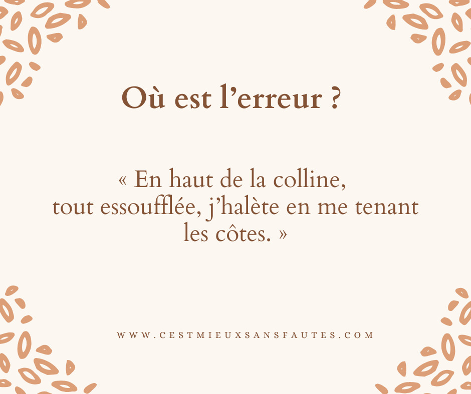 Enfin, attardons-nous sur la construction un peu bancale de la phrase. En effet, le fait de faire suivre « colline » de « tout essoufflée » peut prêter à confusion et s’apparenter à une anacoluthe (rupture dans la construction syntaxique d’une phrase). Dans ce cas, le travail du correcteur peut contribuer à l’amélioration de la phrase.