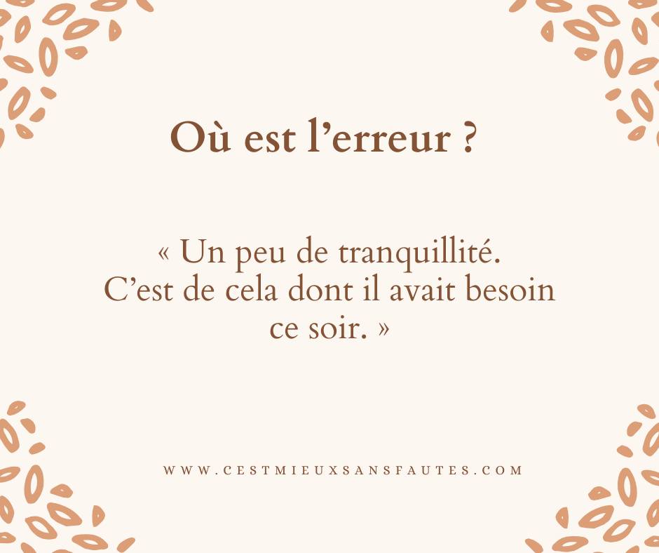 Dans notre exemple, les tournures correctes possibles étaient donc : « Un peu de tranquillité. C’est de cela qu’il avait besoin ce soir » ou « Un peu de tranquillité. C’est cela dont il avait besoin ce soir ».